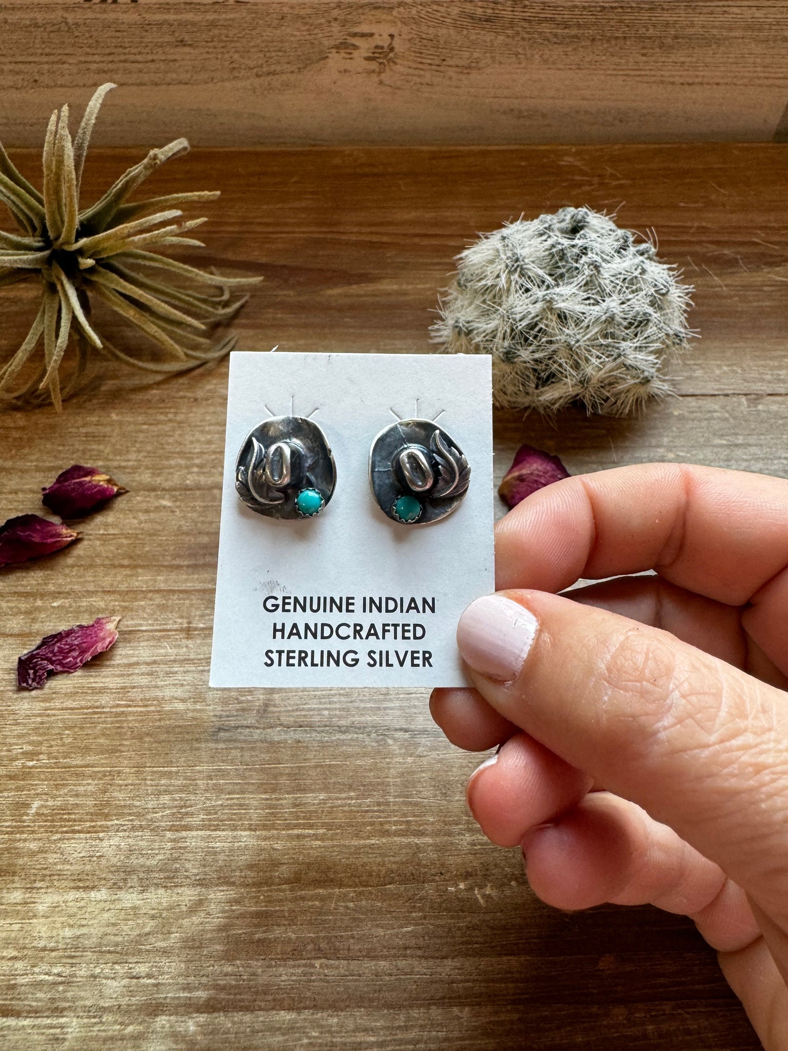 Handmade in the USA, these sterling silver cowboy hat stud earrings feature a Kingman turquoise accent for a unique Western touch. Crafted by Native artisans and stamped sterling for authenticity, each pair carries its own subtle variation due to being man-made. A fun, collectible piece that blends iconic cowboy style with genuine turquoise.