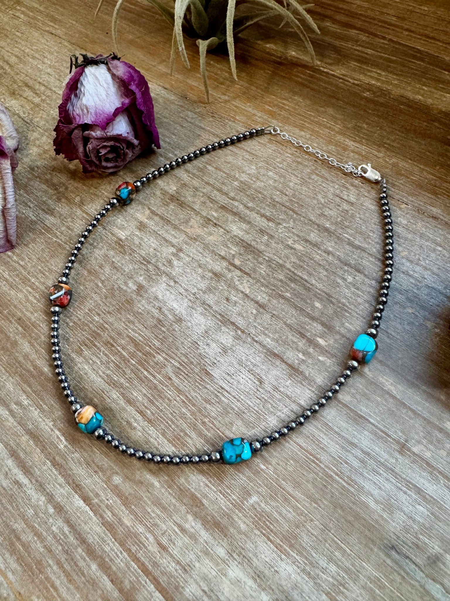 Handmade in the USA by The Bijoux FAB, this necklace is a beautiful mix of Southwestern color and classic silver. It’s crafted with 3mm sterling silver pearls and accented by five beads of mixed turquoise and spiny oyster, each separated by two 4mm sterling silver pearls for added shine and structure. Every necklace is unique due to the natural variation in the stones. Finished with a sterling silver clasp and extender, it measures 15 inches plus extender, making it perfect for layering or wearing as a standalone statement.